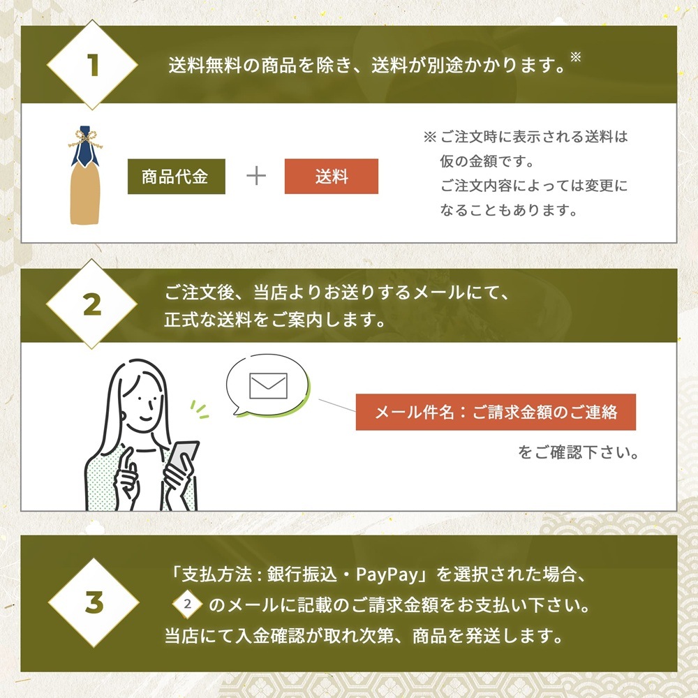 :お得な「おまとめ発送」の送料適用など、ご注文内容によって送料が変わります。ご注文後にお送りするメール(件名:ご請求金額のご連絡)にて「正式な送料」をご案内致します。※事前に確認したい場合は、メール・電話にてお問合せ下さい。