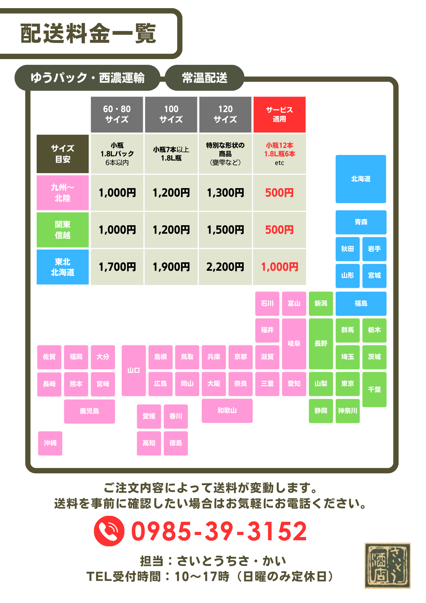 ◆事前に送料を確認したい場合:お手数ですが、メールまたは電話にてお問合せ下さい。商品・数量・配送エリア・ギフト箱ご希望の有無に応じて、送料をご案内致します。